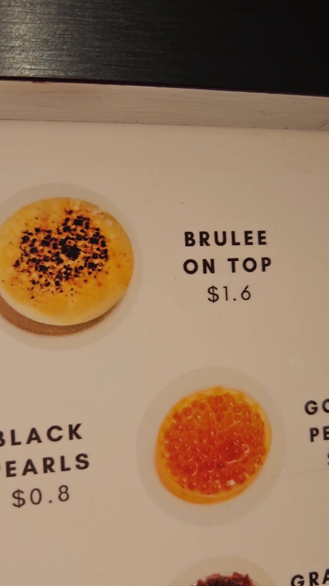 Large. Contains brulee on top, pearls, black sugar fresh milk