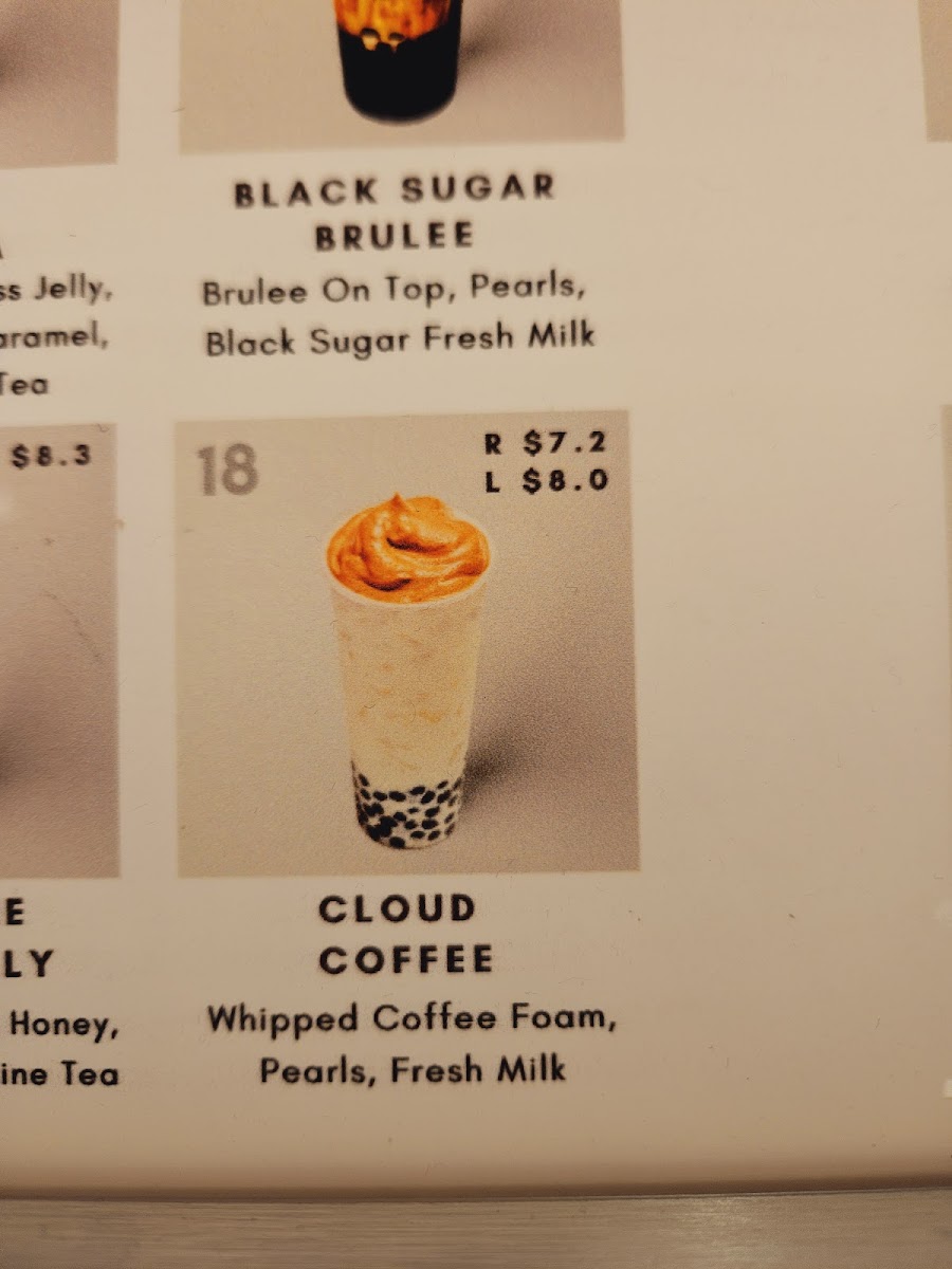 Large. Contains whipped coffee Foam, pearls, fresh milk